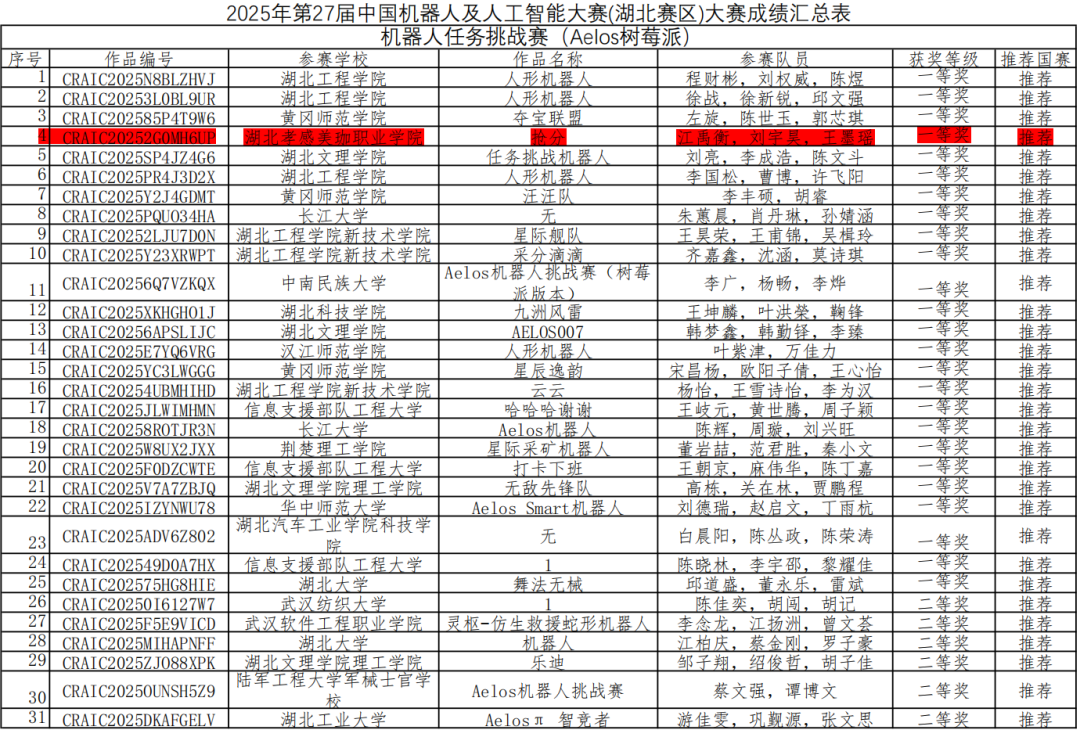 近日,备受瞩目的第二十七届中国机器人及人工智能大赛省赛圆满落幕,我校智能制造学院学子与华中科技大学、华中师范大学、武汉理工大学、中国地质大学、中南民族大学、信息支援部队工程大学、陆军工程大学等一众985、211大学同台竞技。一举斩获省级一等奖1项(省赛第四名)、二等奖2项、三等奖1项!顺利赢得全国总决赛的珍贵入场券!