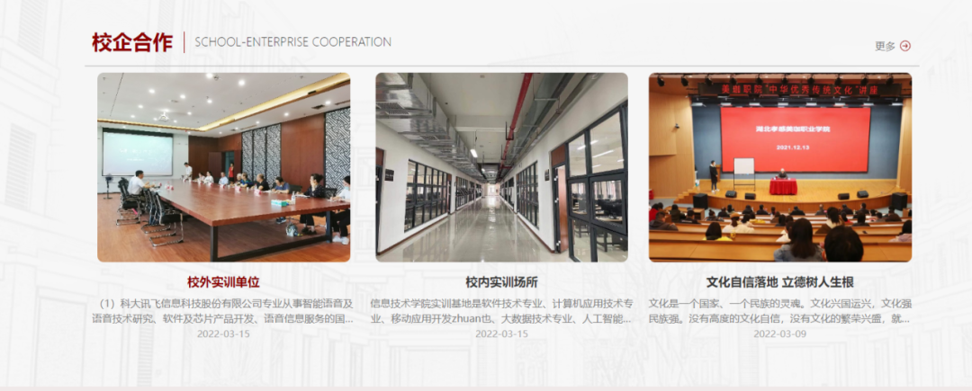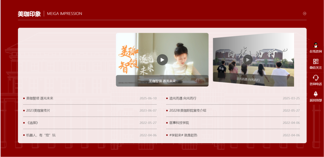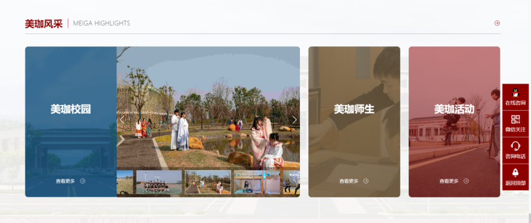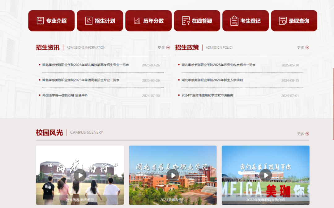 视觉焕新:职教特色与科技感并重。新官网突破传统网站平台刻板框架,以美珈红为主色调,融合动态视频与模块化设计,全方位的展示学校的发展状况,用户可直观查看学校的教学楼、行政楼、宿舍等实景,更加直观地感受学校的办学环境。 网站首页新增“数字美珈”栏目,很明显展示学校的各项数据,浏览者可更加直观地了解学校的基本情况;“美珈印象”——学校的形象视频,让大家更加直观地感受学校的办学环境与办学理念;“媒体美珈”栏目反映的是各大媒体对美珈职院的报道,让美珈的故事、美珈的声音传播得更远,这助力美珈知名度美誉度达到新高度;“美珈荣誉”展示学校的荣誉证书、校企合作授牌等,将强有力增强美珈职院办学的公信力。 内容重构:凸显产教融合优势。美珈职业学院各个学院、职能部门各司其职;“教学科研”栏目定期推送学校教学特色,展示学校老师的教学科研成果,进一步强化学校的职业导向;教务处新增教务系统、课程平台,让学校师生一站式登录——课表查询、成绩查询等更为便捷;各二级学院新增校企合作专栏,动态展示学院校企合作成果、实训基地建设等,强化职业导向;网站“美珈风采”栏目,定期更新美珈师生奋斗的故事,记录学生从青涩到成熟的蜕变历程,传递有温度的职教品牌形象。 功能优化:一站式服务更加便捷。“人才引进”专栏通过整合学校的需求信息,及时发布信息,帮助大家快速获取有效信息,为考生、家长及社会公众提供更高效、更便捷的数字化服务平台,进一步彰显学校“中西合璧、德才兼备、知行合一、敬业乐群”的办学理念;同时网站简化菜单层级,为有需要的人提供对接的高效通道。 新版官网不仅是技术升级,更是学校办学理念的延伸。美珈职院希望通过这个平台,让更多人看到职业教育的广阔前景,同时深化与企业、社会的互联互通,培养真正符合产业需求的高素质技能人才。 对于广大考生和家长而言,我们的官网可提供权威信息—— 1 招生信息查询:学校官网能为考生及家长提供全面且准确的招生信息,如招生政策、专业设置、录取规则、历年分数线等,帮助考生了解报考条件和要求,制定合理的报考计划。 2 学校概况介绍:官网对学校的历史、办学理念、师资力量、学科建设、校园文化等进行详细介绍,让考生及家长全面了解学校的综合实力和特色,以便评估学校是否符合自身需求。 3 专业详情展示:学校官网会对各个专业的培养目标、课程设置、就业方向、发展前景等进行详细说明,帮助考生及家长深入了解专业内涵,做出更契合自身兴趣和职业规划的专业选择。 4 专业对比分析:官网可提供不同专业之间的对比信息,帮助考生及家长更清晰地了解各专业的特点和差异,从而做出更明智的专业选择。 5 常见问题解答:学校官网将整理并发布考生及家长常见的问题及答案,涵盖招生、教学、生活等多个方面,方便考生快速获取信息,解决疑惑。 6 在线咨询服务:通过设置在线咨询窗口、留言板或咨询邮箱等方式,考生及家长可直接向学校招生部门或相关职能部门提问,获得及时、准确的解答。 7 校园生活展示:官网通过图片、视频、文字等形式展示丰富多彩的校园生活,如社团活动、学术讲座、文化艺术演出、体育赛事等,让考生及家长感受到校园的活力和文化氛围,了解学生的课余生活。 8 学生风采展示:官网展示优秀学生的事迹、成果和获奖情况等,让考生及家长看到学校培养出的优秀人才,了解学校对学生综合素质的培养成效,增强考生对学校的认可度和报考意愿。 9 报考指南发布:学校官网发布报考指南,为考生提供从报名到考试、录取等各个环节的详细指导,帮助考生了解报考流程和注意事项,避免出现失误。 10 学业规划建议:官网还可提供一些学业规划方面的建议和资源,帮助考生提前了解大学的学习模式和要求,为即将到来的大学生活做好准备。 欢迎考生及其家长和所有关心美珈的社会各界人士、在校师生关注、浏览美珈职院官网,并参与互动。欢迎大家提出宝贵意见,帮助我们不断改进。 网址:https://www.hbxgmgpi.edu.cn/