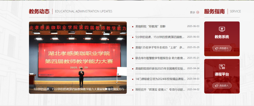 在职业教育蓬勃发展的新时代,2025年6月湖北孝感美珈职业学院更新了一站式数字门户——学校官网(https://www.hbxgmgpi.edu.cn/)。这里不仅是展示学校形象的窗口,更是学子、家长和社会各界了解美珈特色的桥梁。