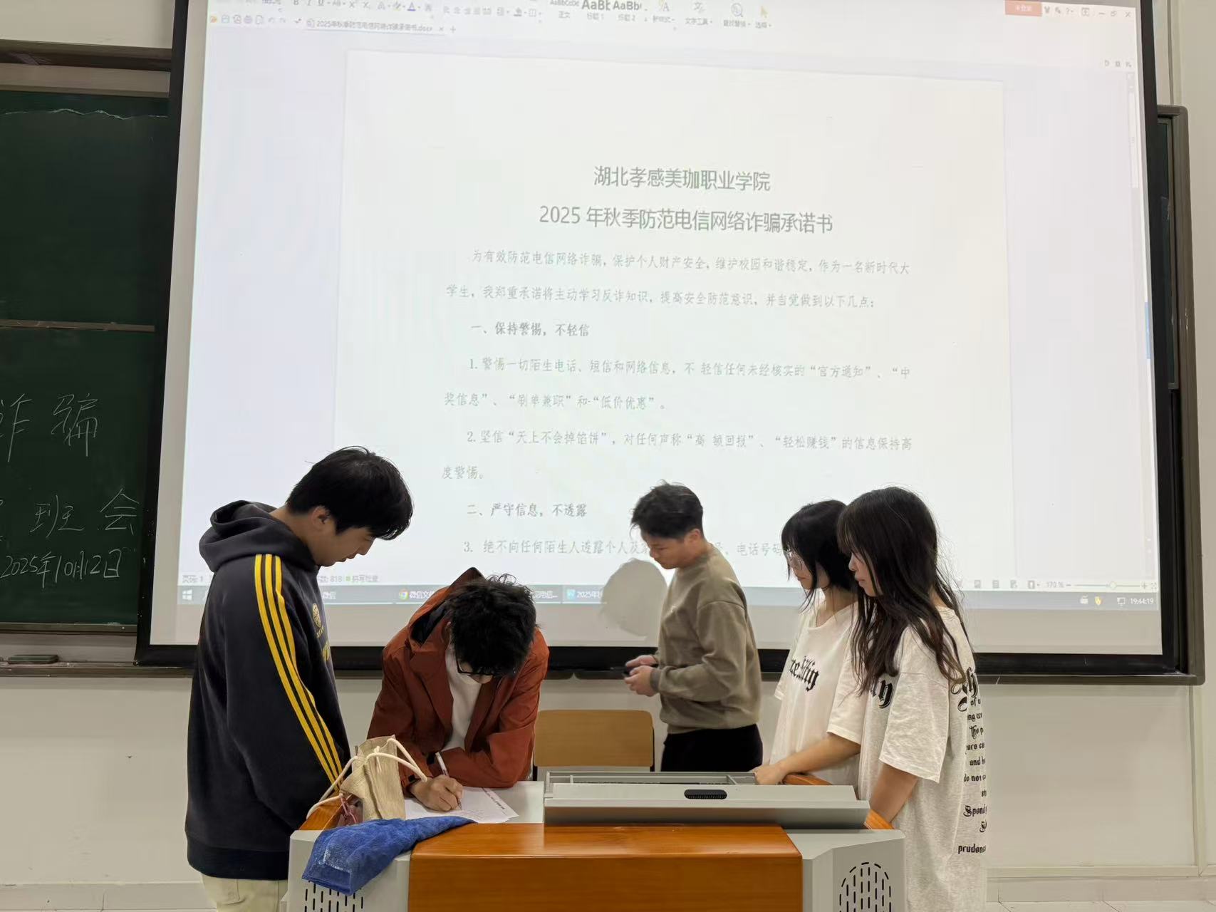 为守护学生财产安全,筑牢校园反诈堡垒,10月12日,湖北孝感美珈职业学院学工处组织全校各行政班级开展2025年秋季防范电信网络诈骗主题班会,并签署反诈承诺书。