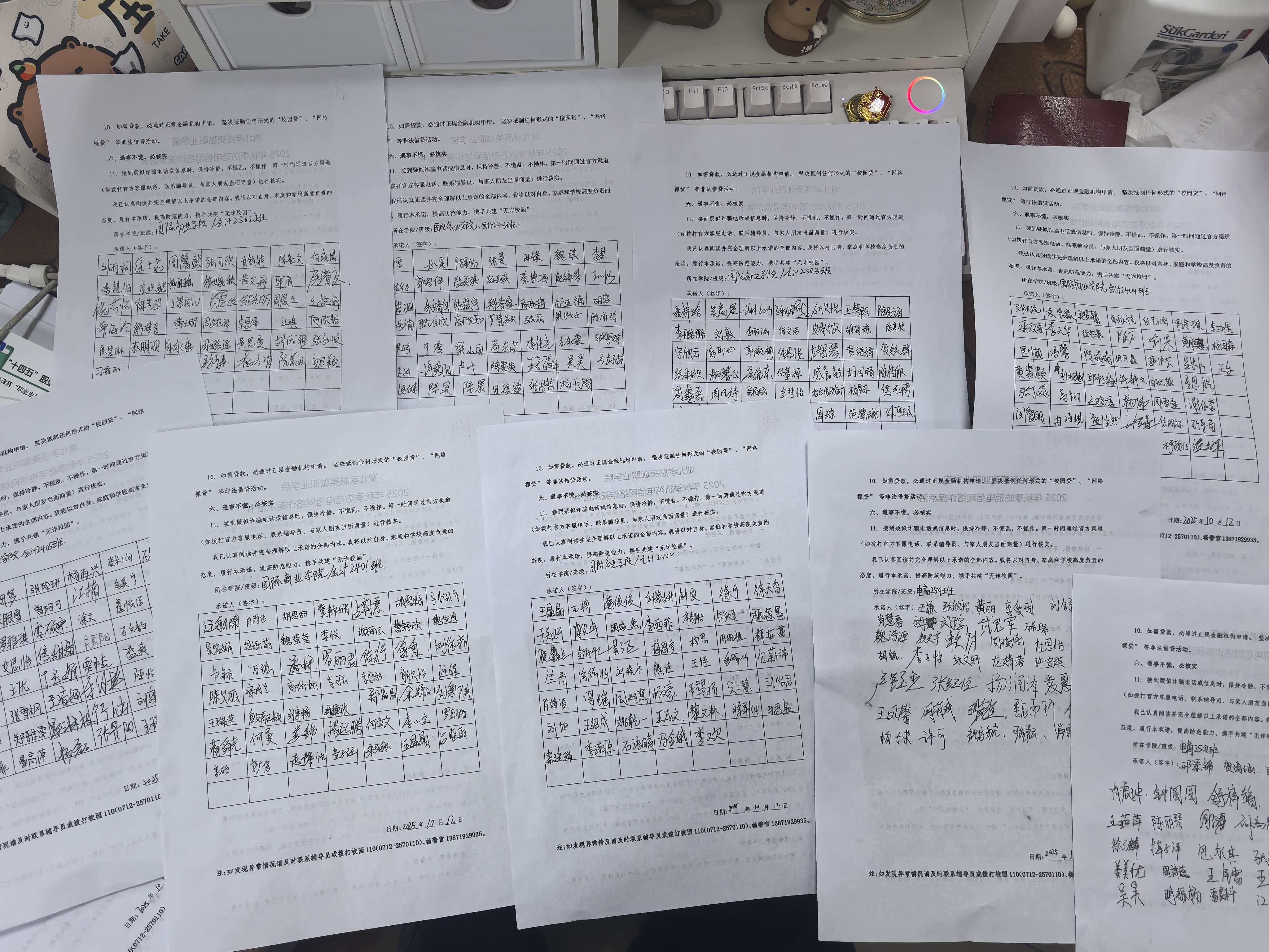 班会现场,班干部领学承诺书,结合 “校园贷陷阱”“刷单被骗” 等案例,逐条解析 “不轻信、不透露、不转账” 等反诈要点。班委、寝室长率先登台签署,全体学生座位同步签字,仪式感拉满。同时,大家现场存贮反诈咨询电话,辅导员全程拍照存档。