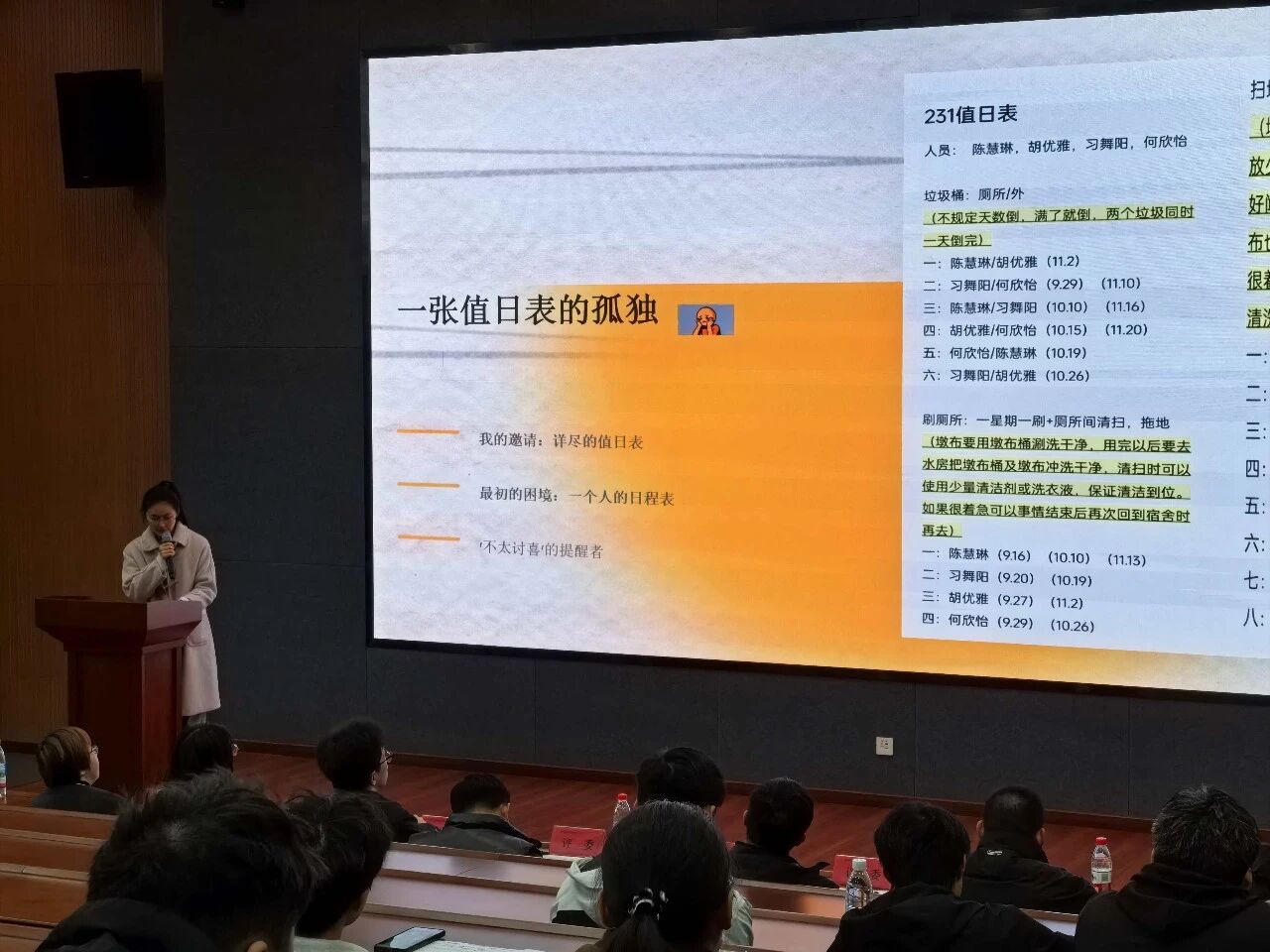 “说室友”真情演讲赛是整场活动的泪点与亮点。晋级选手们脱稿登台,分享与室友的独家故事:有初入校园时的相互关照,有迷茫困惑时的并肩前行,有生病受伤时的细心陪伴,有熬夜备考时的彼此鼓励。